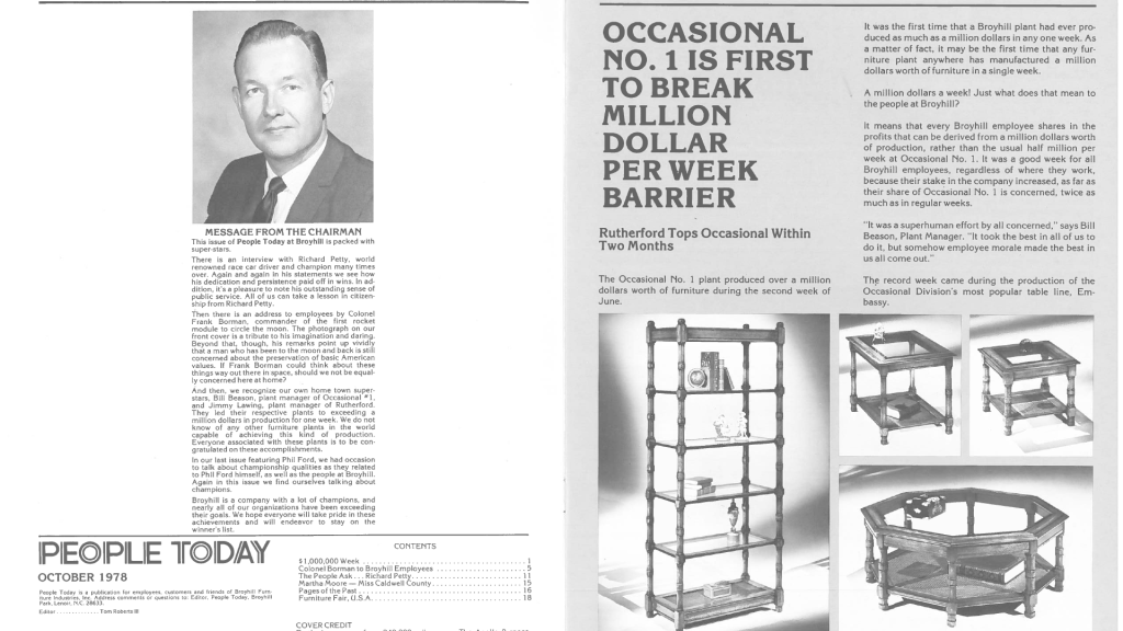 At its peak, Broyhill employs up to 7,500 workers across more than 20 factories, becoming a dominant U.S. furniture producer.